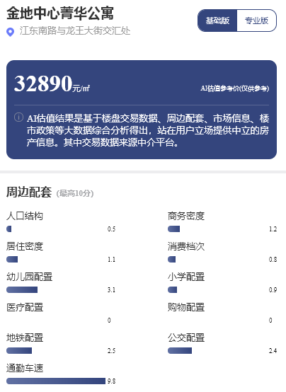 以距離嘉華嘉璟峰僅533米的金地中心菁華公寓項(xiàng)目為例,該項(xiàng)目與嘉璟峰共享著地鐵、商業(yè)和醫(yī)療等基礎(chǔ)配套。每經(jīng)品房小程序顯示,金地中心菁華公寓的估值參考價(jià)約為3.29萬(wàn)元/平方米,在包括人口結(jié)構(gòu)、居住密度、商務(wù)密度等在內(nèi)10項(xiàng)指標(biāo)中,通勤車速得分為9.8分,而其他指標(biāo)得分均低于4分,這在一定程度上反映了該項(xiàng)目周邊人流相對(duì)較為稀少,整體居住配套仍處于待完善狀態(tài)。